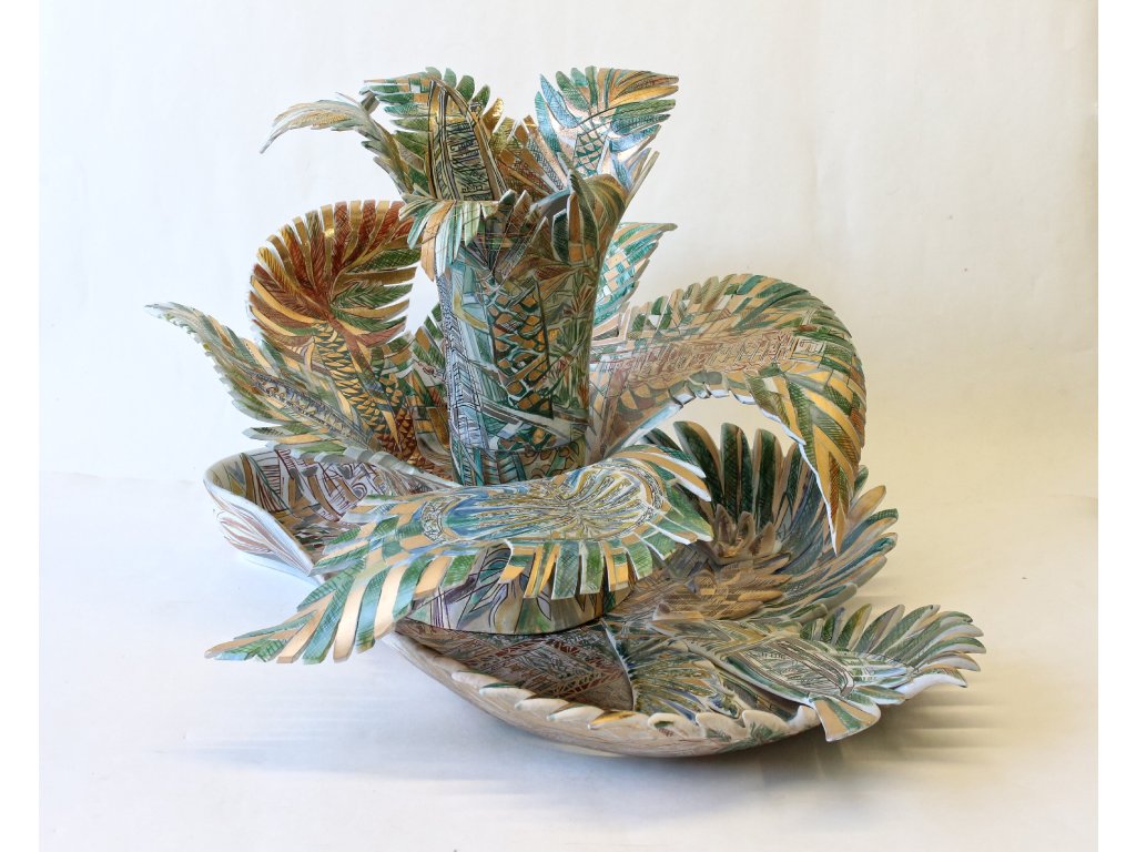 Ve většině případů však po vyjmutí z formy dochází po uschnutí k začištění a následnému jemnému zahlazení. Dalším krokem je takzvaný přežah, kdy odchází více jak 50% vázané vody. Na tento přežah autor zakreslí celou originální kompozici a dochází k identickému prořezu vysokofrekvenční frézkou.