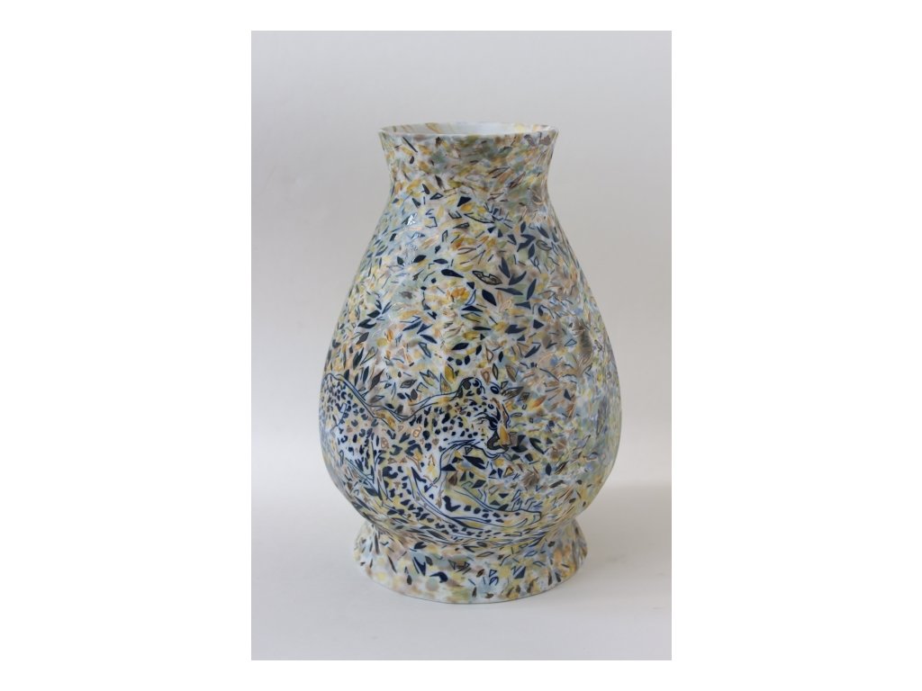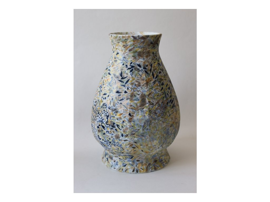 Pravý karlovarský porcelán pálený na 1400˚C. Kobalt, sole, zlato, povrchové barvy, biskvit. Vychází z grafického cyklu "Mimikry - gepardi v keři", ale díky šíři pláště vázy je zde přidán další ležící gepard z profilu. V celkovém vyznění působí zvířata více abstrahovaná a ztracená ve vegetaci, než v grafických listech. Celkový vjem působí imaginárně a impresivně.